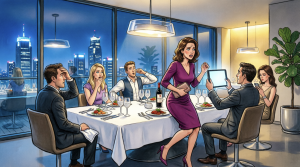 Dessert came out around nine. Some ridiculous layered cake with edible gold leaf and spun sugar accents that probably cost more per slice than my first car payment. The band shifted to a slow tune. The sky turned cobalt above the rooftop and the city below us glittered with that indifferent beauty cities have when human beings are busy ruining one another at table level.
