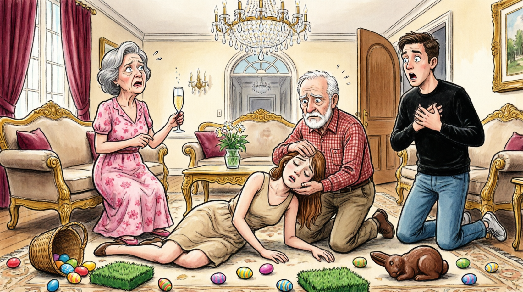 The floor was scattered with the remnants of a children’s Easter basket—shredded green plastic grass, torn gift wrapping, and brightly colored chocolate eggs.