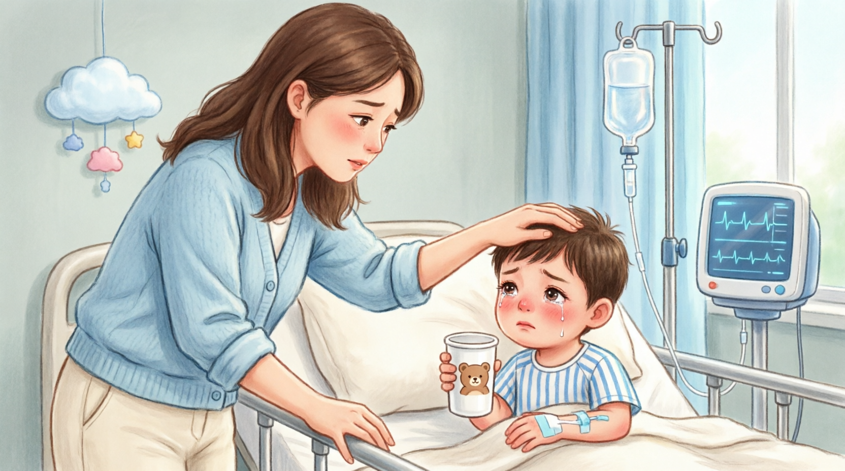 Lucy was sitting upright on the bed, clutching a paper cup in both hands as if it might disappear. Her cheeks were flushed, her hair damp at the temples. Her eyes— those enormous brown eyes that normally looked mischievous and warm— were too wide, too fixed.