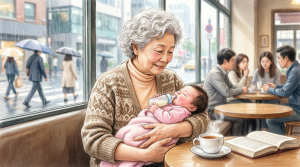 Inside, it was warm, filled with the comforting smell of coffee and pastries. I sat near the window, hoping for a moment of peace. But Amy started crying again, so I picked her up and tried to soothe her gently.